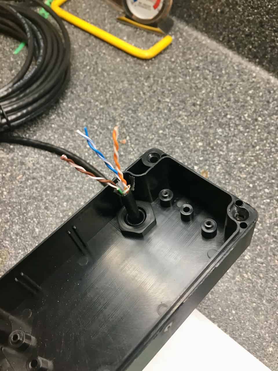 The box that houses the sensor circuit board has a waterproof entrance point for the cable. I needed to first place the threaded cap on the cable, remove the grey rubber piece and move it onto the cable then place it all within the opening on the box. Tightening it all down makes it water tight. There are then 4 wire connections within the sensor box via a connector block with screws. I tinned the stranded wires before making the connections.
