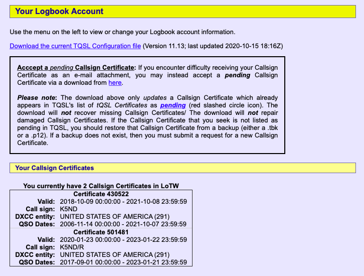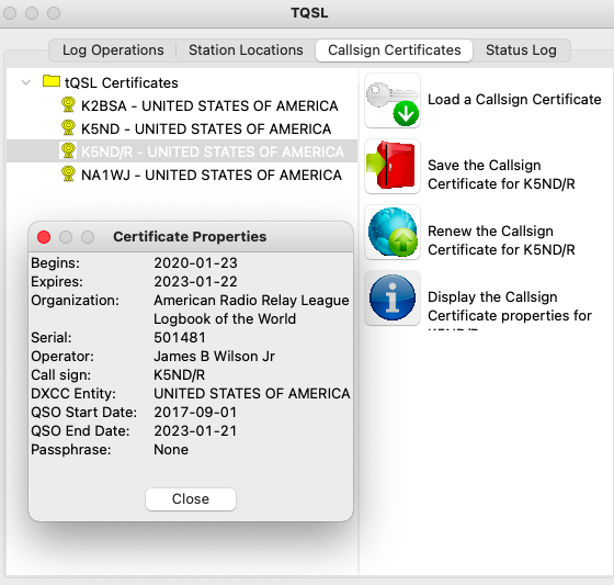 When the certificate arrives via email, you just load it into TQSL. The first window below is LoTW that shows my certificates: K5ND and K5ND/R. The second window show the certificate properties for K5ND/R in TQSL.