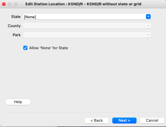 If you’ll look closely at the last entry on the station location list (click on the image for the full size version), you’ll see that I’ve labeled it “K5ND/R without state or grid.” Due to some relatively recent changes to TQSL and LoTW, you can actually upload your log and let them take care of the QTH for every QSO.