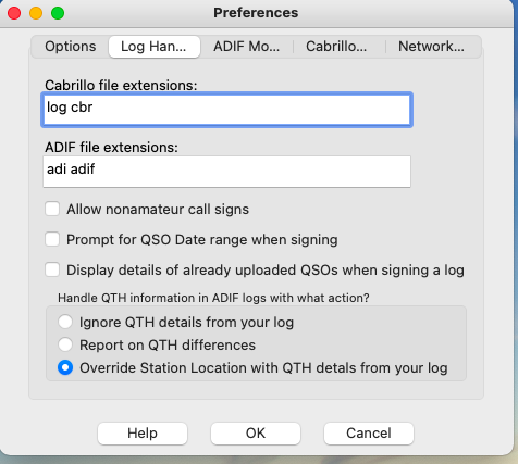 Then under the main TQSL menu select “preferences” and in that window, select “Override Station Locations with QTH details from your log.” See the second window below.