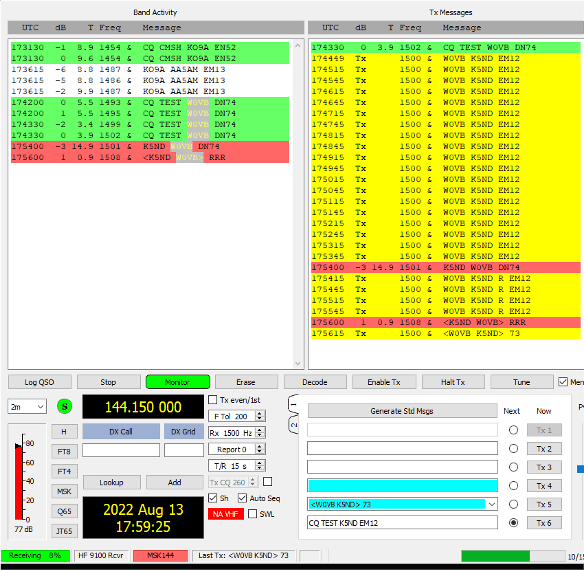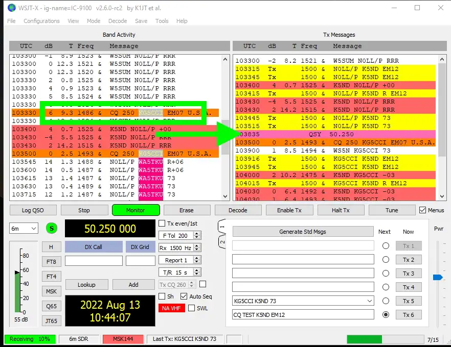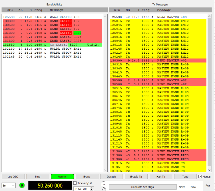 You can see that KG5CCI was calling CQ 250 while transmitting on 50.260, the six-meter meteor scatter calling frequency. When I clicked on his CQ, my transmission moved to 50.250 MHz. This was indicated by the QSY message in pink, followed by the rest of the QSO, which was completed on 50.250.