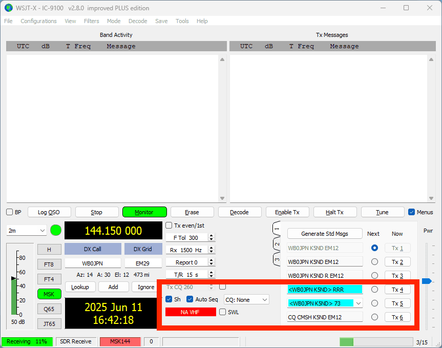 For 2 meters and above, MSK144 QSOs use NA Contest Mode to minimize the number of sequences needed for a complete QSO. However, it’s not uncommon to utilize contest mode on 6 meters and, of course, during contests. Here are the settings.