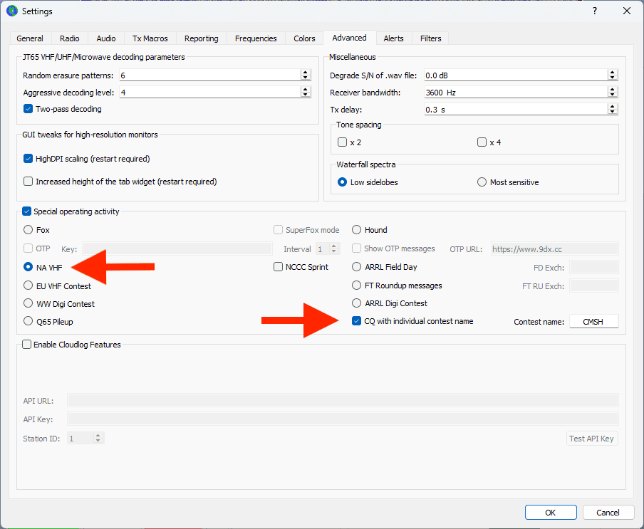 Select the checkbox “special operating activity” and then NA VHF. You can also check the “CQ with individual contest name.” Here, I’ve used CMSH, which indicates that I’m sending a CQ with Contest Mode and SH activated—more on SH below in the sample 2-meter QSO.