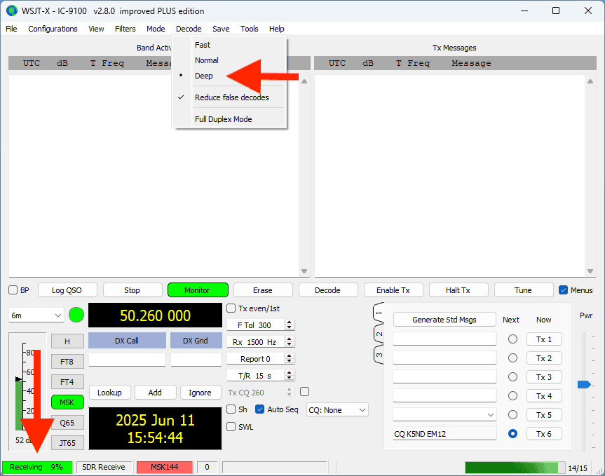 The Decode menu follows, which is a drop-down menu for selecting Fast, Normal, or Deep. K1JT suggests choosing the option that best suits your computer; monitor the CPU usage percentage at the bottom of the screen and select the option that doesn’t overload the CPU. Some suggest that Normal provides the best decodes.