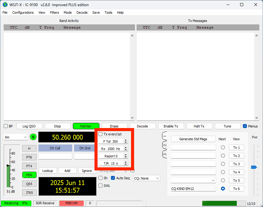 The settings for MSK144 in WSJT-X will generally be the same as those used for FT8, which include rig control, audio, and other parameters. Here are the exceptions for meteor scatter operation.