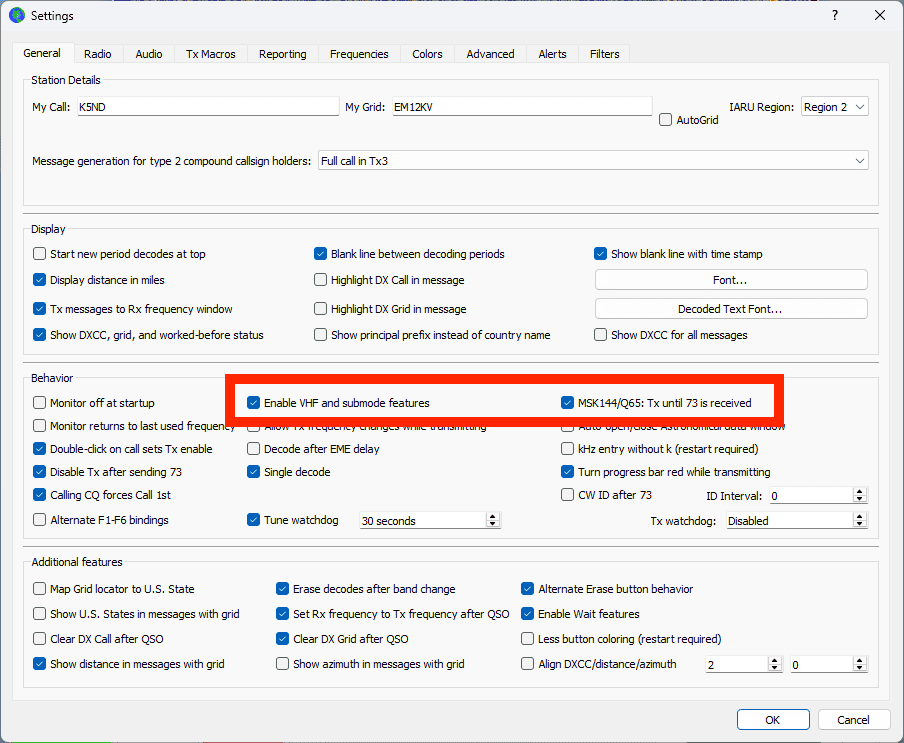 Under the Settings General Tab, make sure you’ve selected “Enable VHF and submode features” along with “MSK144/Q65: Tx until 73 is received.” More on sending 73 later.