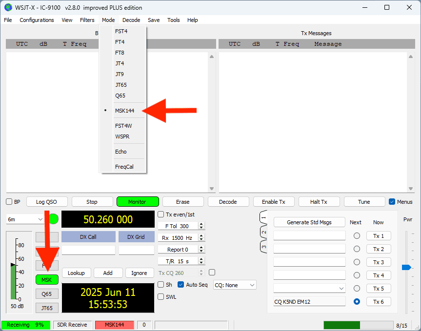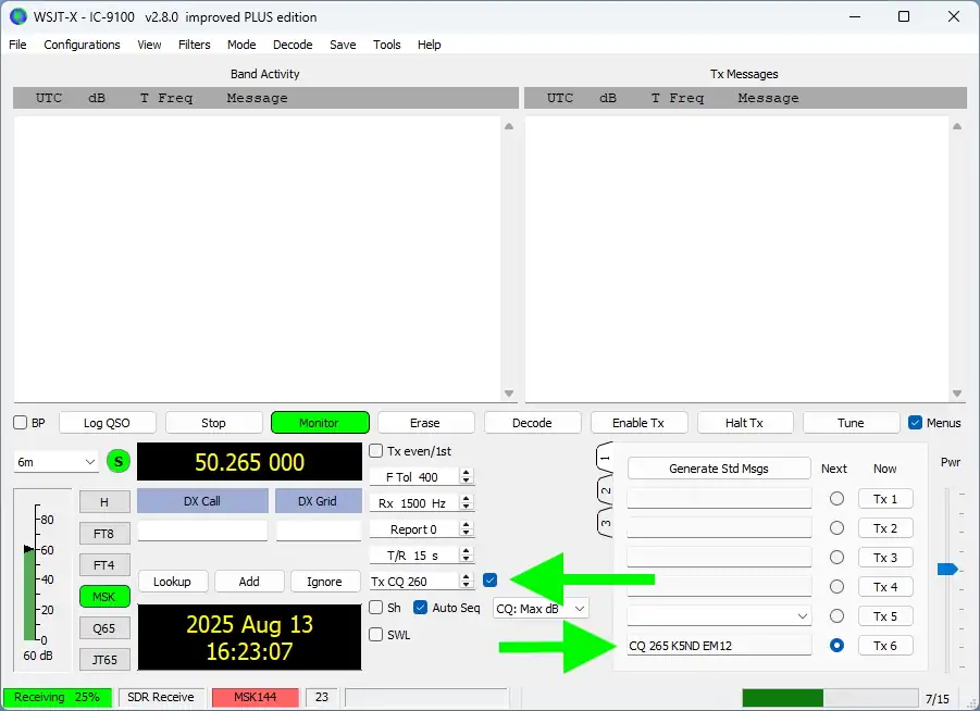 The top arrow above shows the checkbox for setting up a QSY CQ. You enter the QSY transmit frequency in the box near the checkbox. Once you hit “enable TX” you’ll transmit on the Tx CQ setting 260. Your messages will be CQ 265 in this case, since WSJT-X is set to 50.265. Your receiver will monitor 50.265. When someone responds, you select them, and the rest of the QSO happens on 50.265. Try it out during those very busy days or during a contest. Note that the settings in the “radio” tab of WSJT-X for “split operation” need to be “rig” or “fake it” for this option to work.