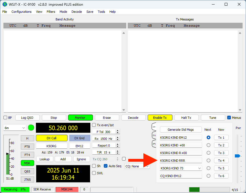 I also strongly recommend using RRR in your sequence instead of RR73. With WSJT, after you send RR73, it logs the QSO. However, with meteor scatter, it’s unlikely that a single transmission of RR73 will actually get through. Therefore, you can use RRR as often as necessary to receive confirmation from the other station that the QSO is complete.