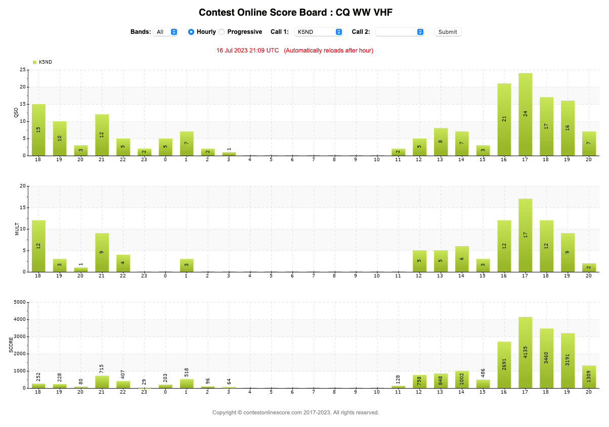 The CQ WW VHF Contest 2023 edition did not match the incredible conditions experienced during the June VHF contest. Saturday was pretty slow, but Sunday picked up, providing a reasonable score. Plus, I picked up a new 2-meter grid thanks to N5ZY/R. I just missed him in what would have been another new grid; oh well.