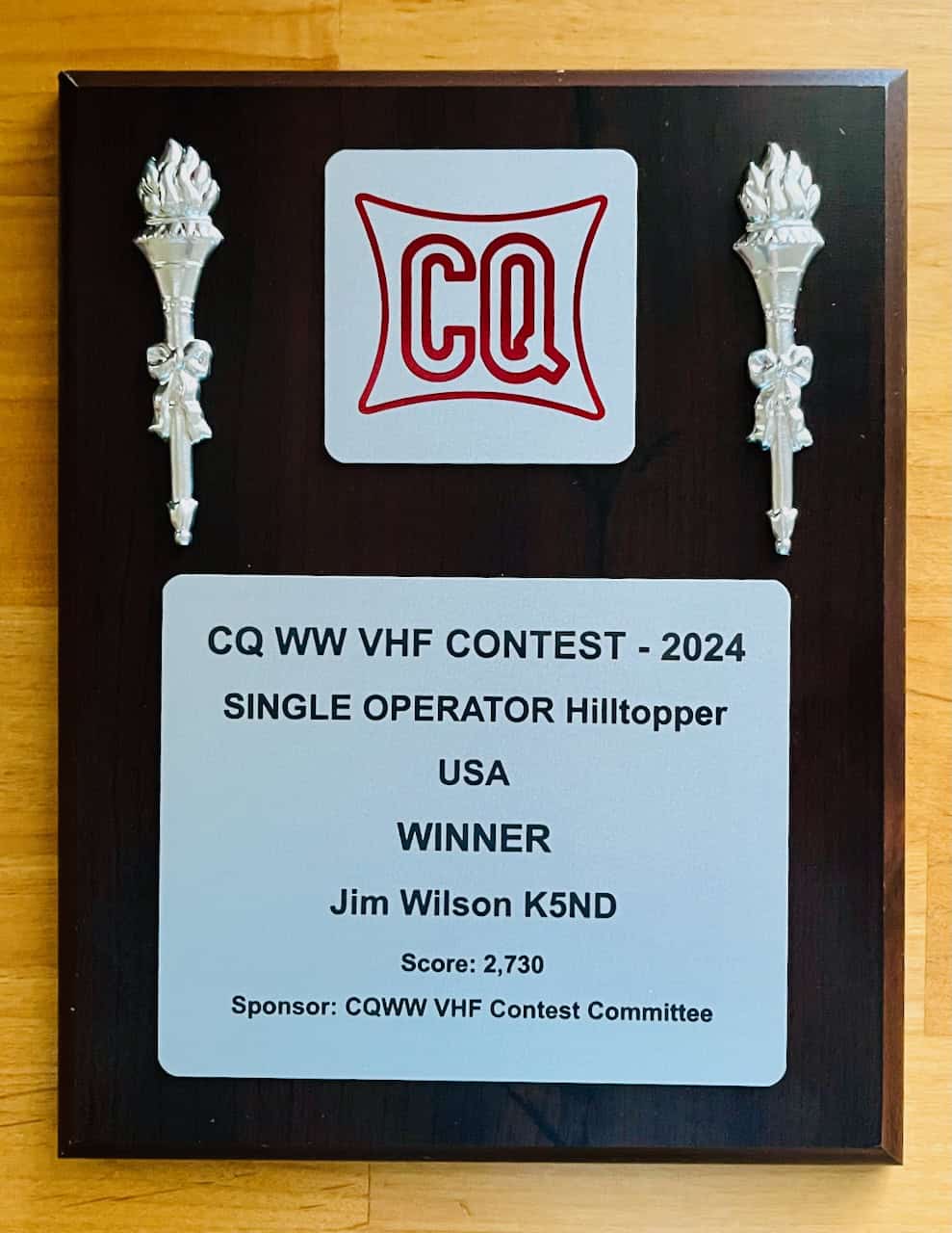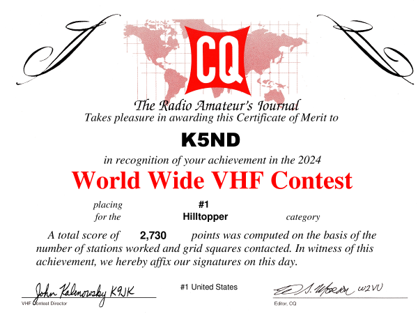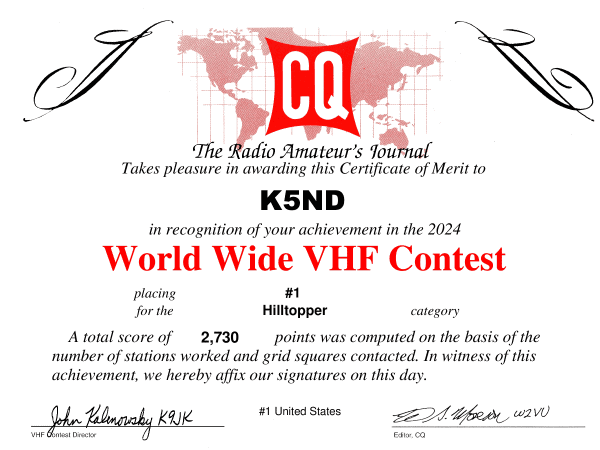 The CQ WW VHF 2024 Contest results were published today. I won the USA Hilltopper category, and I placed second in the World and North America. Here’s the certificate. Plus, they sent me a plaque! Probably the only one I’ll ever see in my ham radio contesting life.