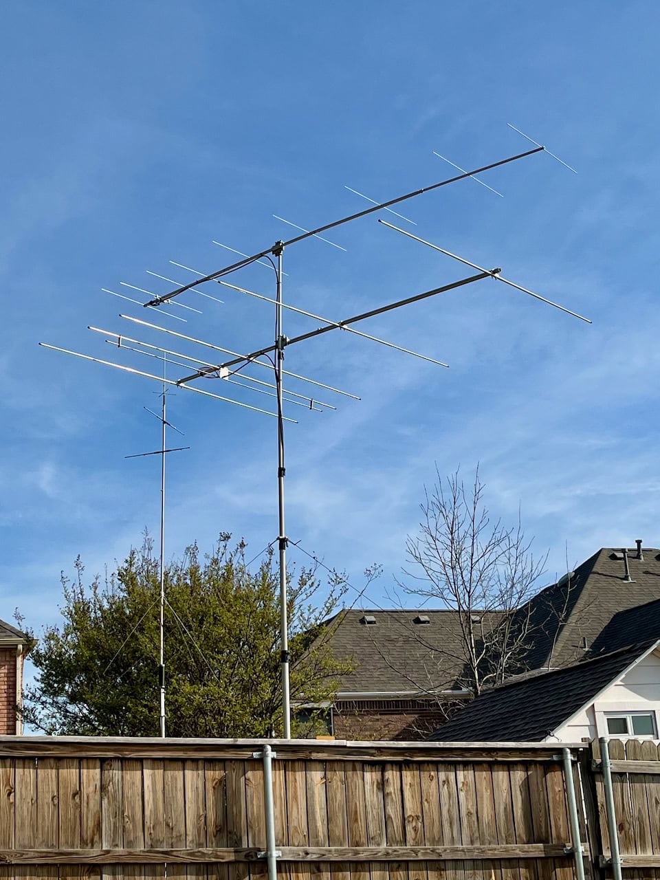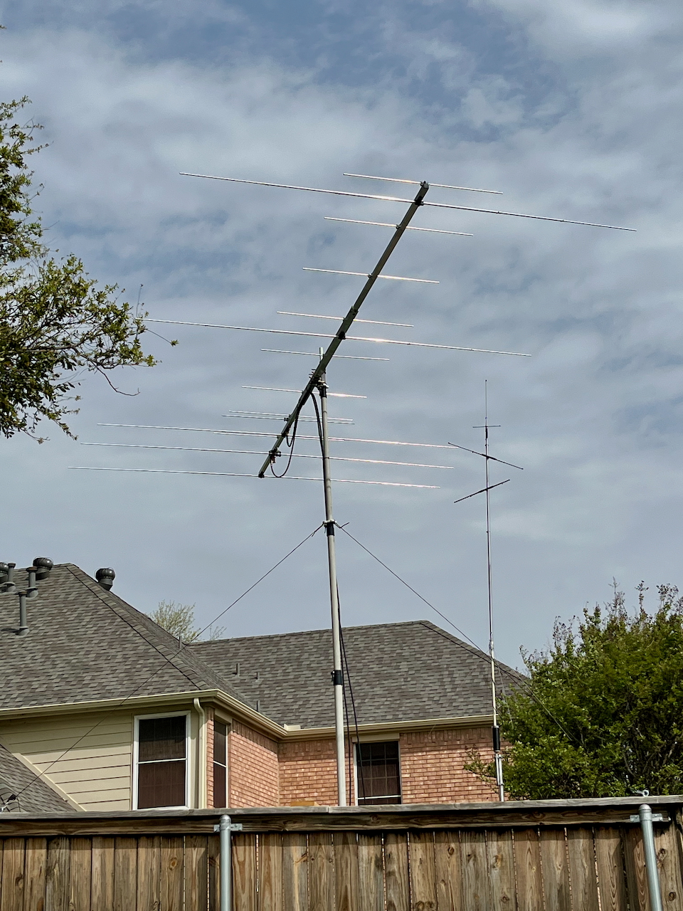We cut down a large tree in the southeast corner of our yard. Subsequently, I moved my pushup mast and antennas to that corner, making them much more visible to my neighbors and the March winds.