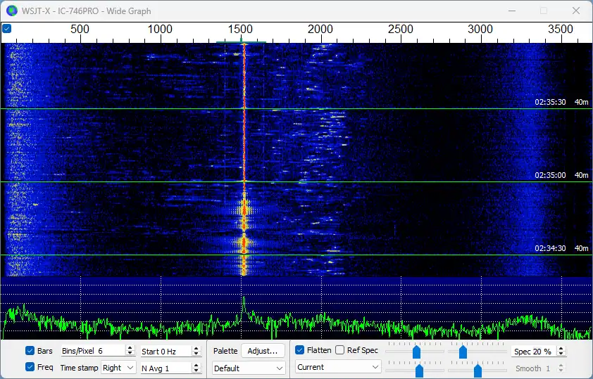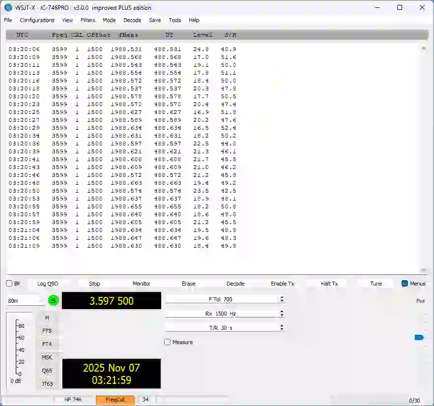I use the capabilities of WSJT-X for frequency calibration and measuring test signals. This involves warming up my Icom IC-746PRO with the CR-388 high-stability TCXO for a couple of days. Then, about an hour before the test, I calibrate WSJT-X against several frequency standards from WWV and CHU. I measure the one-minute keydown for the test signal and then average the measured samples. You can find the screenshots nearby.