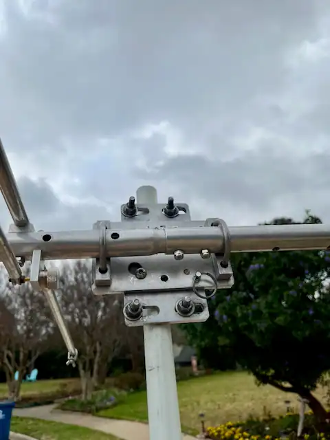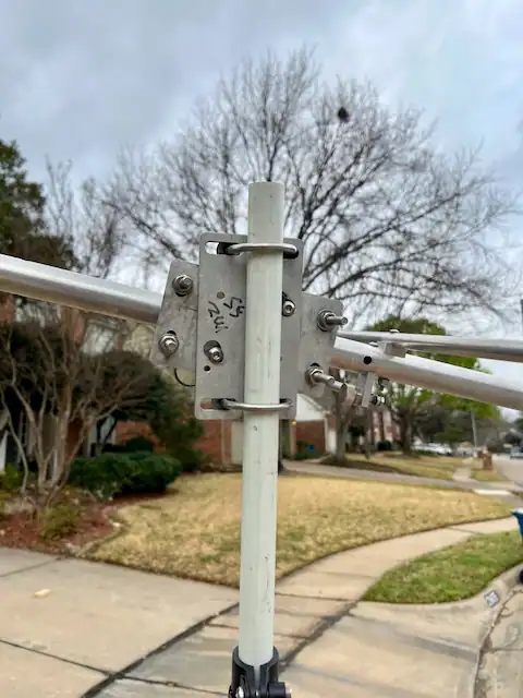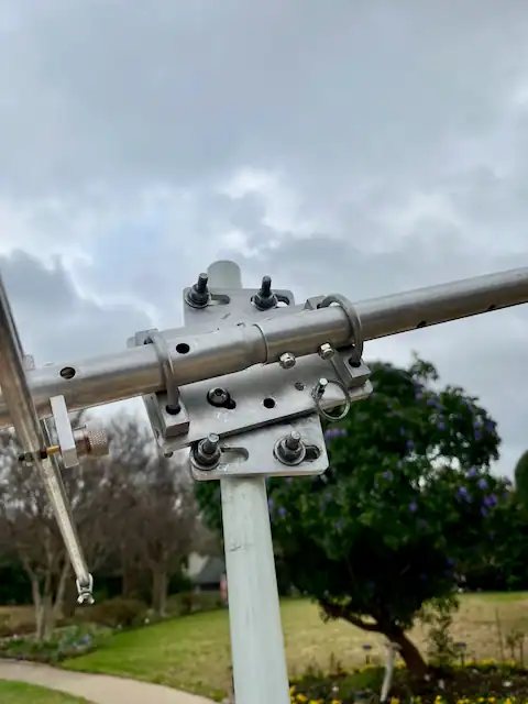 My next favorite antenna is the M2 6M-3SS. It’s heavier at 6 pounds and requires a bit more setup, but it offers 8.1 dBi gain with a 64-degree beamwidth. The front-to-back ratio is 28 dB. It uses a gamma match on the driven element, which I feed through a balun. Set